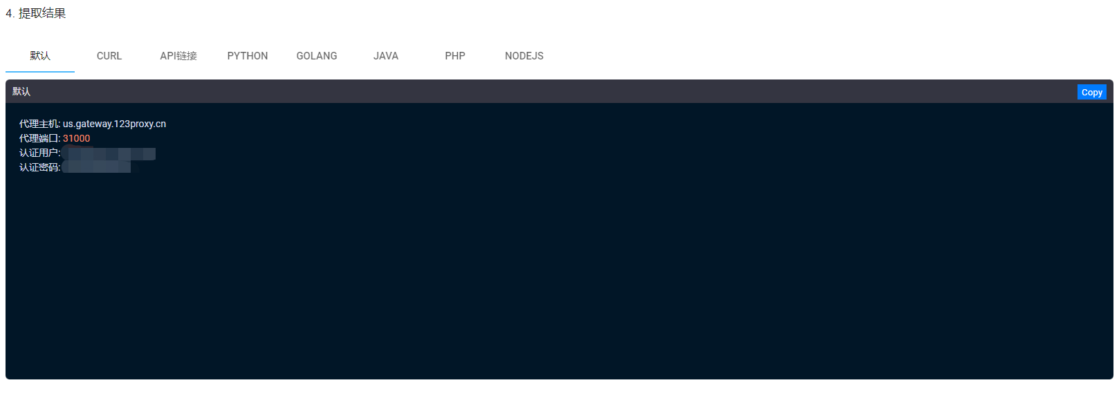 • 代理主机: 代理服务器的地址,流量套餐返回的是隧道网关的域名,通过这个域名,网关会自动将请求转发到不同的代理服务器,从而实现自动切换IP功能。