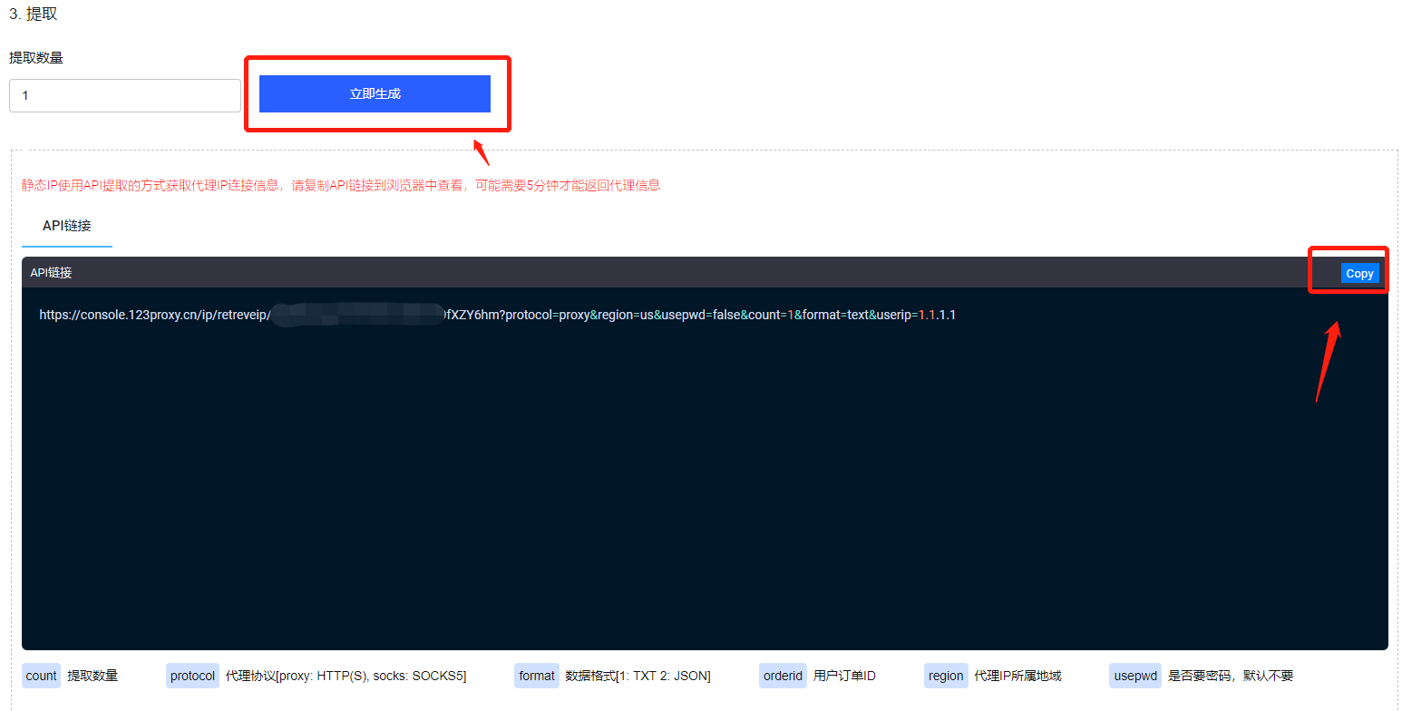 通过额外的密码认证、数据格式、代理协议的选择,以及提取IP数量等参数设置后,你需要点击立即生成按钮,来生成代理IP列表的URL链接, 以便后续通过程序或浏览器访问该URL获取你的静态代理IP列表。 img_22.png